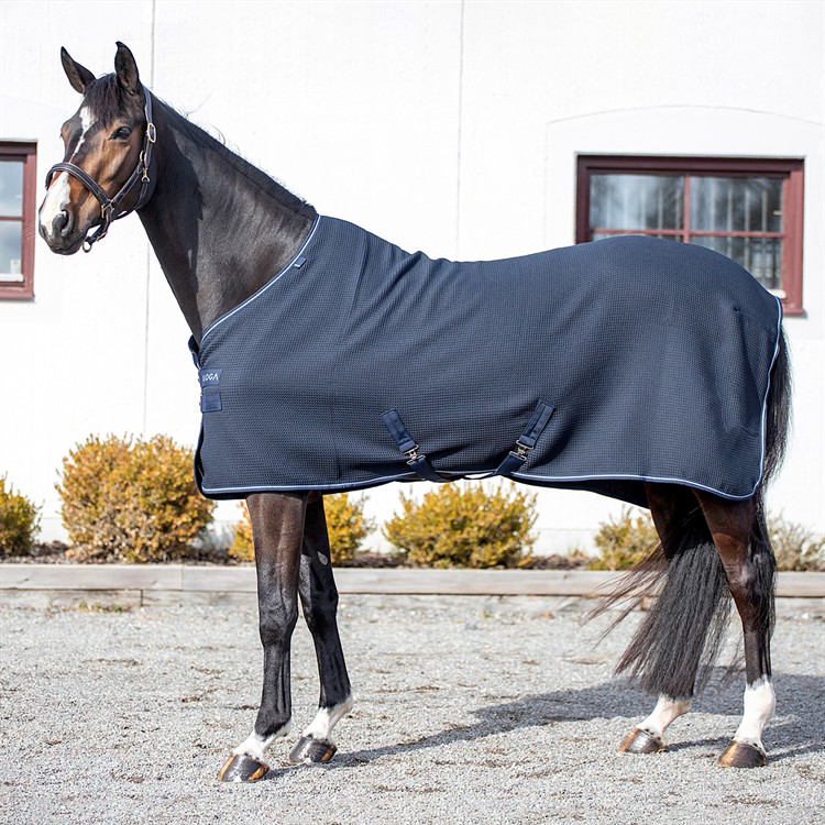 Fukttransport: Polyester-våffeltyget transporterar effektivt bort fukt från hästens rygg och håller hästen torr.