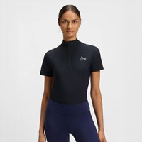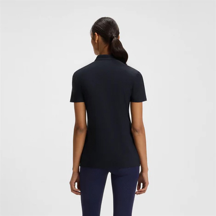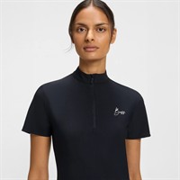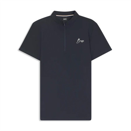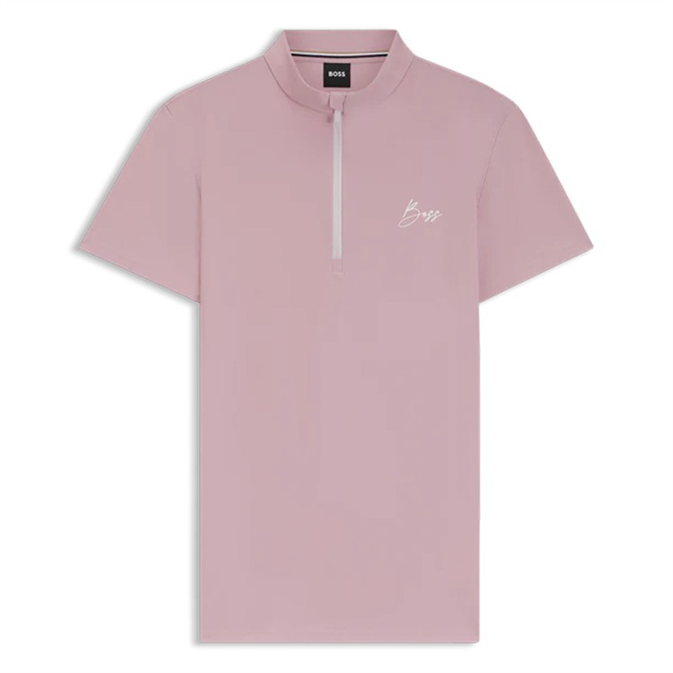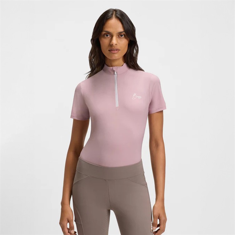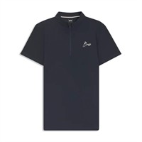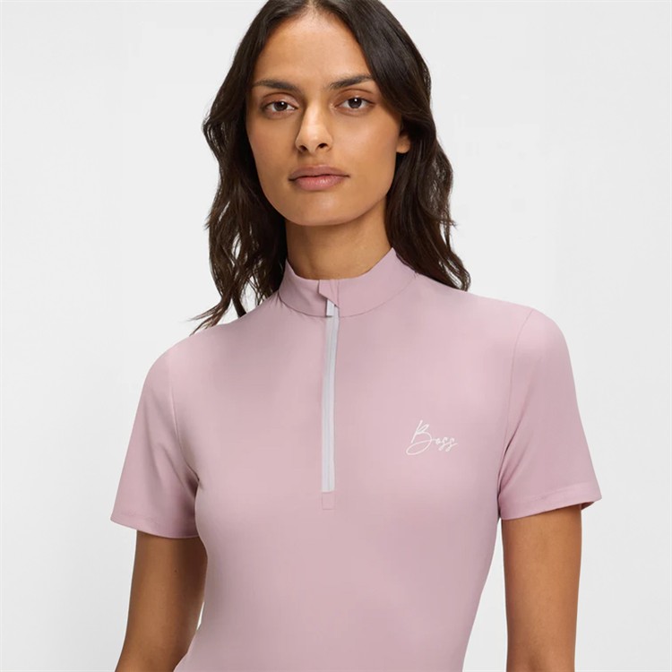 Ridskjorta med halvlånga ärmar i andningsbart, elastiskt material med solskyddsfaktor och "BOSS" handskrivet på bröstet.