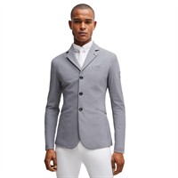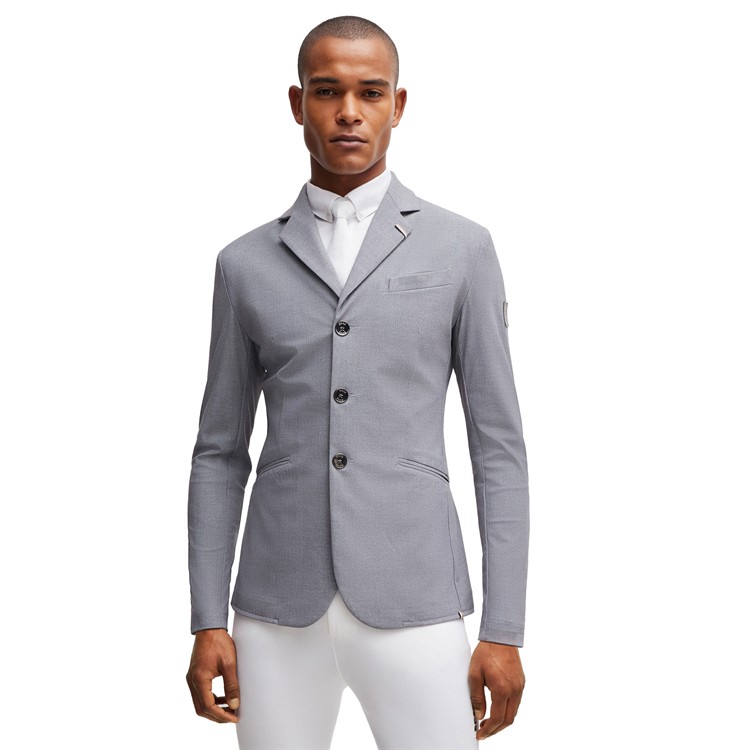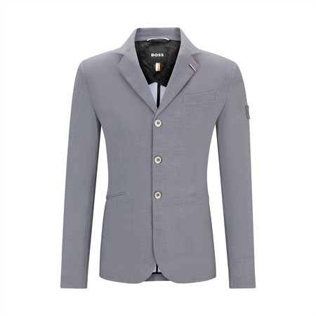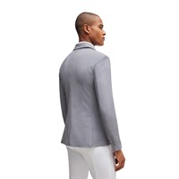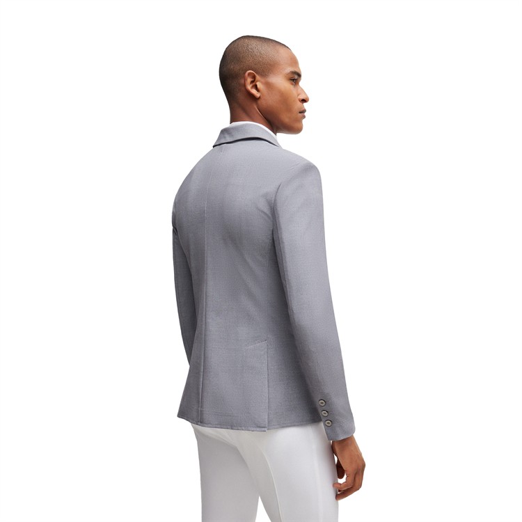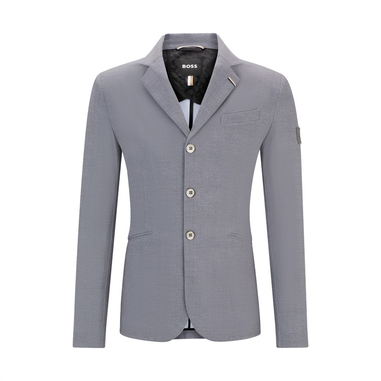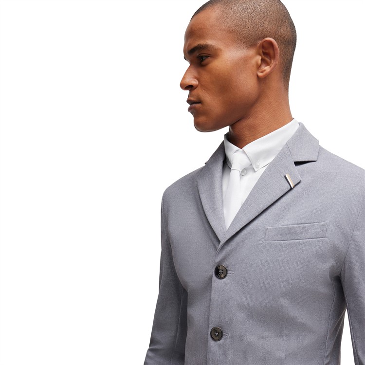 Sportigt elegant tävlingskavaj i gråmelerad BOSS-stil med metallknappar prydda med BOSS-logotyp. Den optimala passformen ger maximal rörelsefrihet. Kavajens utseende liknar ett strukturerat tyg i ett klassiskt peppar-och-salt-mönster.