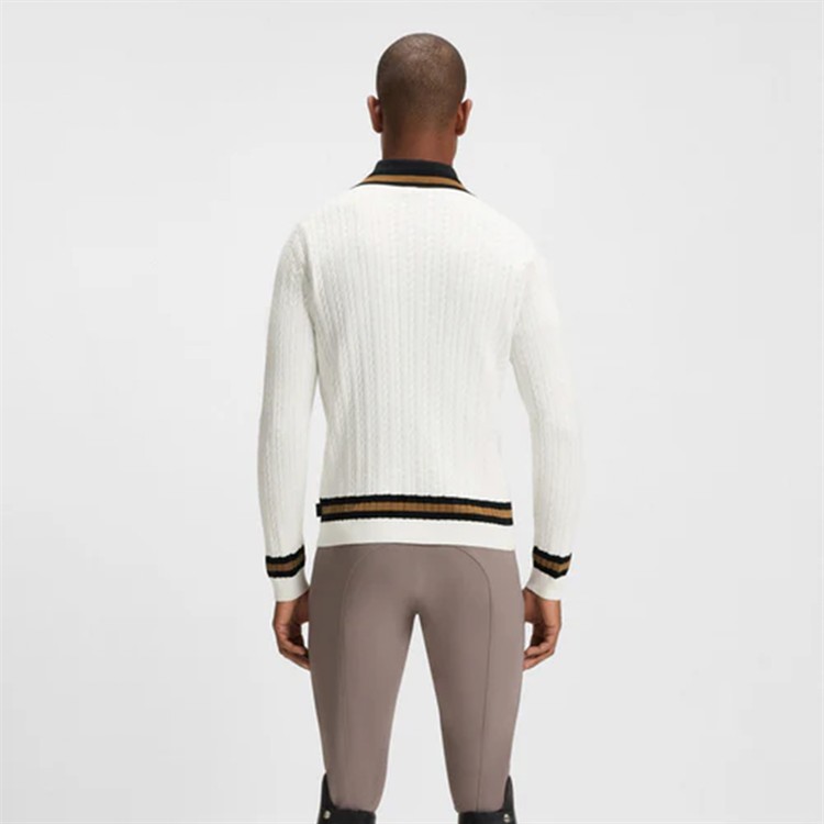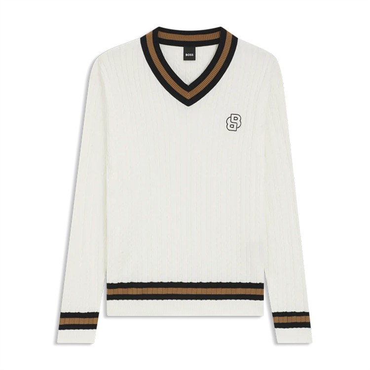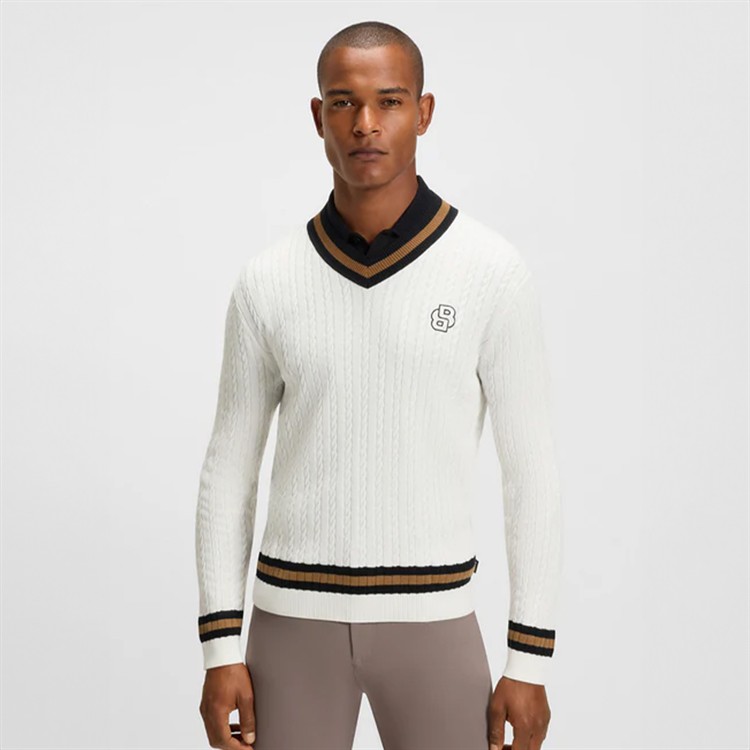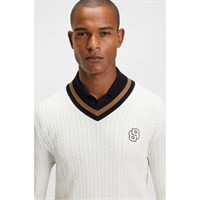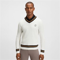Sstickad tröja med V-ringning, kontrasterande ränder samt kontrasterande ränder på ärmslut och nederkant. Tröjan har ett broderi av det nya Double B-logotypen i kontrasterande färg på vänster bröst.