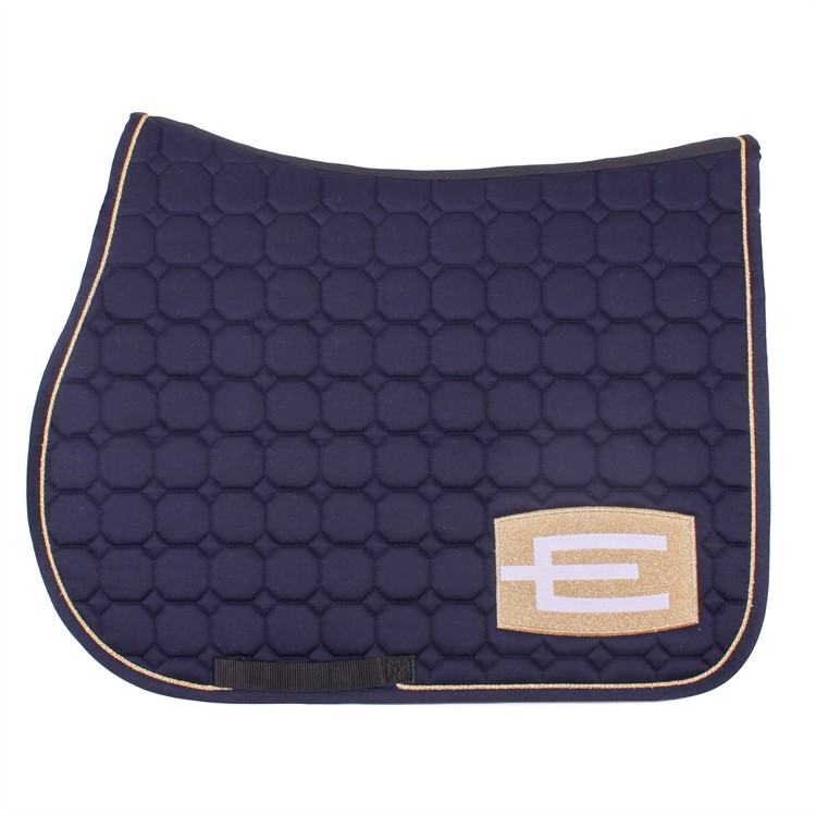 Blått hoppschabrak med den populära E-loggan E07 (Glitter gold-white) på vänster sida, samt med passpoal P358 (gold glitter, 3 mm).