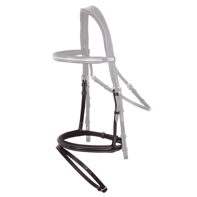 Paddad nosgrimma designad för tränset Thamar, tillverkad i exklusivt italienskt läder. De stilrena vita sömmarna och eleganta silverspännen kompletteras av en smakfull mönstersömnad som ger ett sofistikerat uttryck. Den mjuka paddningen ger ökad komfort och en behaglig passform för hästen, medan den höga läderkvaliteten säkerställer både hållbarhet och en vacker finish över tid.