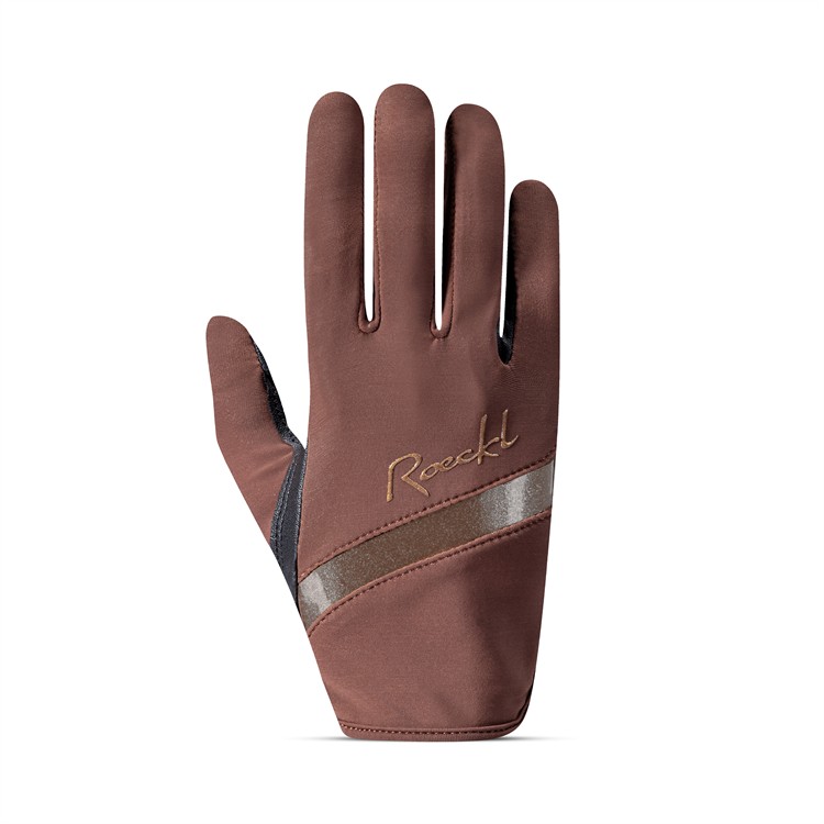Ridhandske i trendig design. En diskret glittrande logotyp och ett skimmrande band på handryggen pryder denna funktionella ridhandske som är anpassad till den kvinnliga handens anatomi. Silkesmjukt nylon med en hög andel elastan på handryggen garanterar förstklassig komfort, perfekt passform och ultimat rörlighet för fingrarna. Dessutom är den bekväm, andas och torkar snabbt. Ett mjukt och tunt PU-material används i handflatan som säkerställer ett säkert och tillförlitligt grepp om tyglarna utan att kompromissa med den nödvändiga känsligheten när det gäller kontakten med hästens mun. LORRAINE är snabb och enkel att ta på sig tack vare sin glidbara konstruktion. Maskintvättbar vid 30 ° C. ROECKL rekommenderar att tvätta ridhandskar som LORRAINE regelbundet så att de behåller sin funktionalitet.